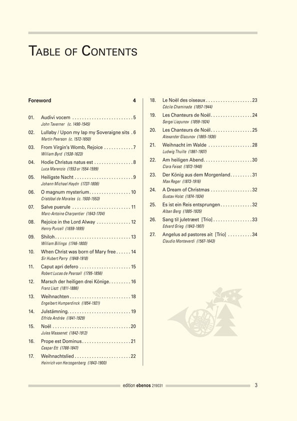 Far beyond the usual Christmas carols, composers over the centuries have created original music that evokes the Yule season. These 25 horn quartet (and 2 trio) arrangements of works by Glazunov, Holst, Humperdinck, Liszt, Purcell, et al., will make programming a substantial and varied Christmas concert an easy task.