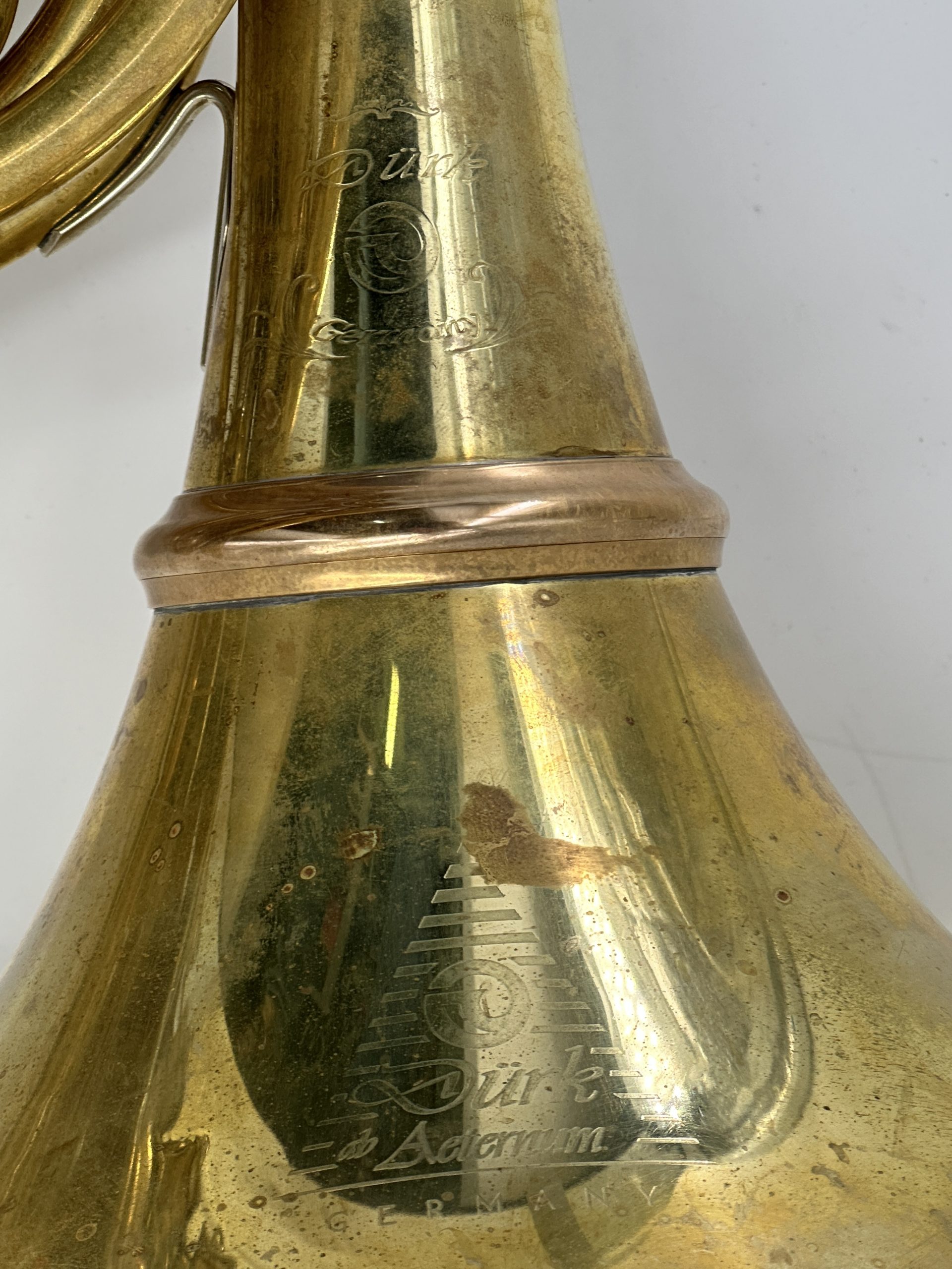 Dürk Full Triple B/F/hoog F “Ab Aeternum”: Messing, afschroefbare beker met LOT, verstelbare pinkhaak, snoermechaniek, ongelakt inclusief Gig Bag. ! Ex instrument Kerry Turner !