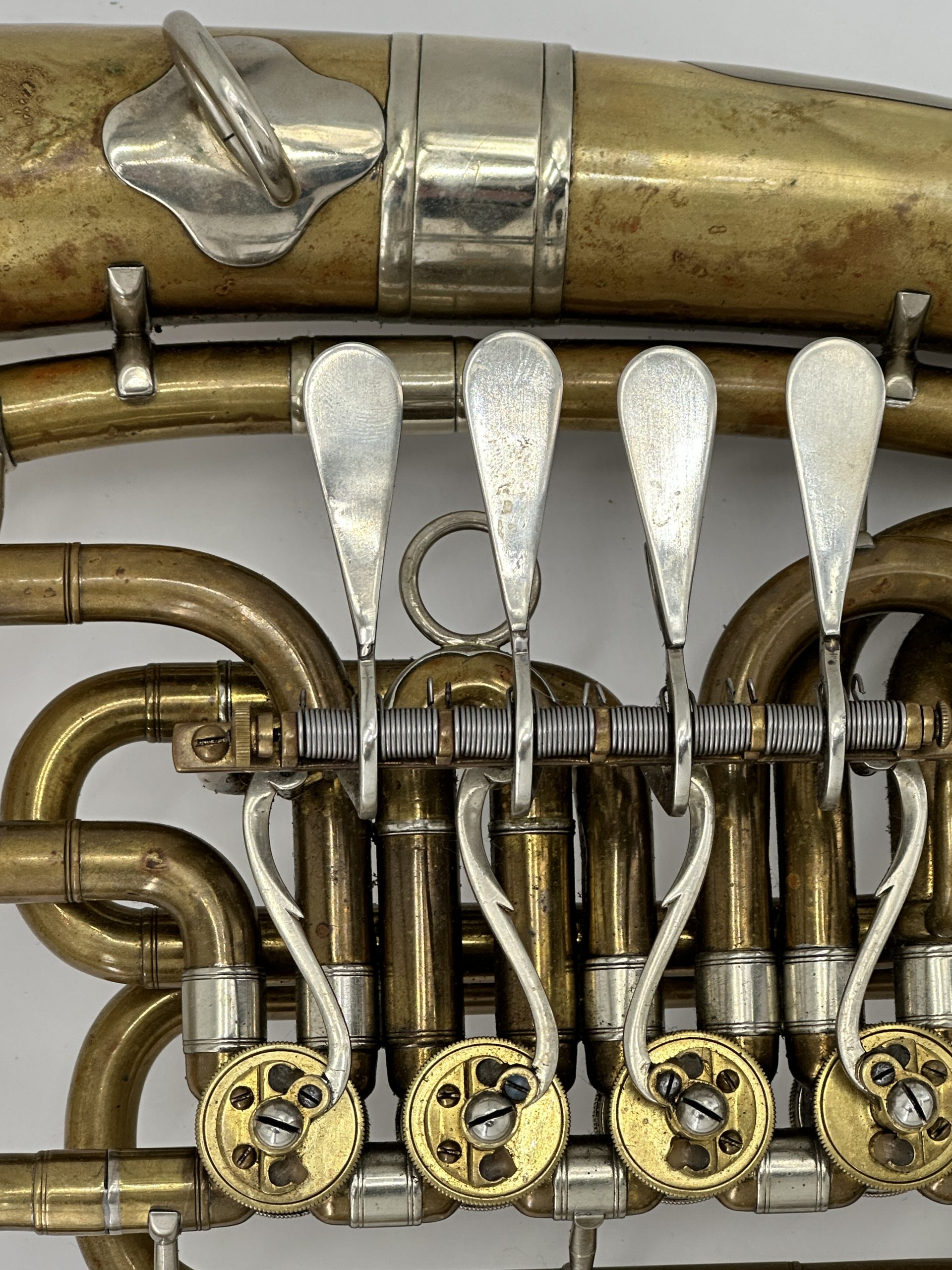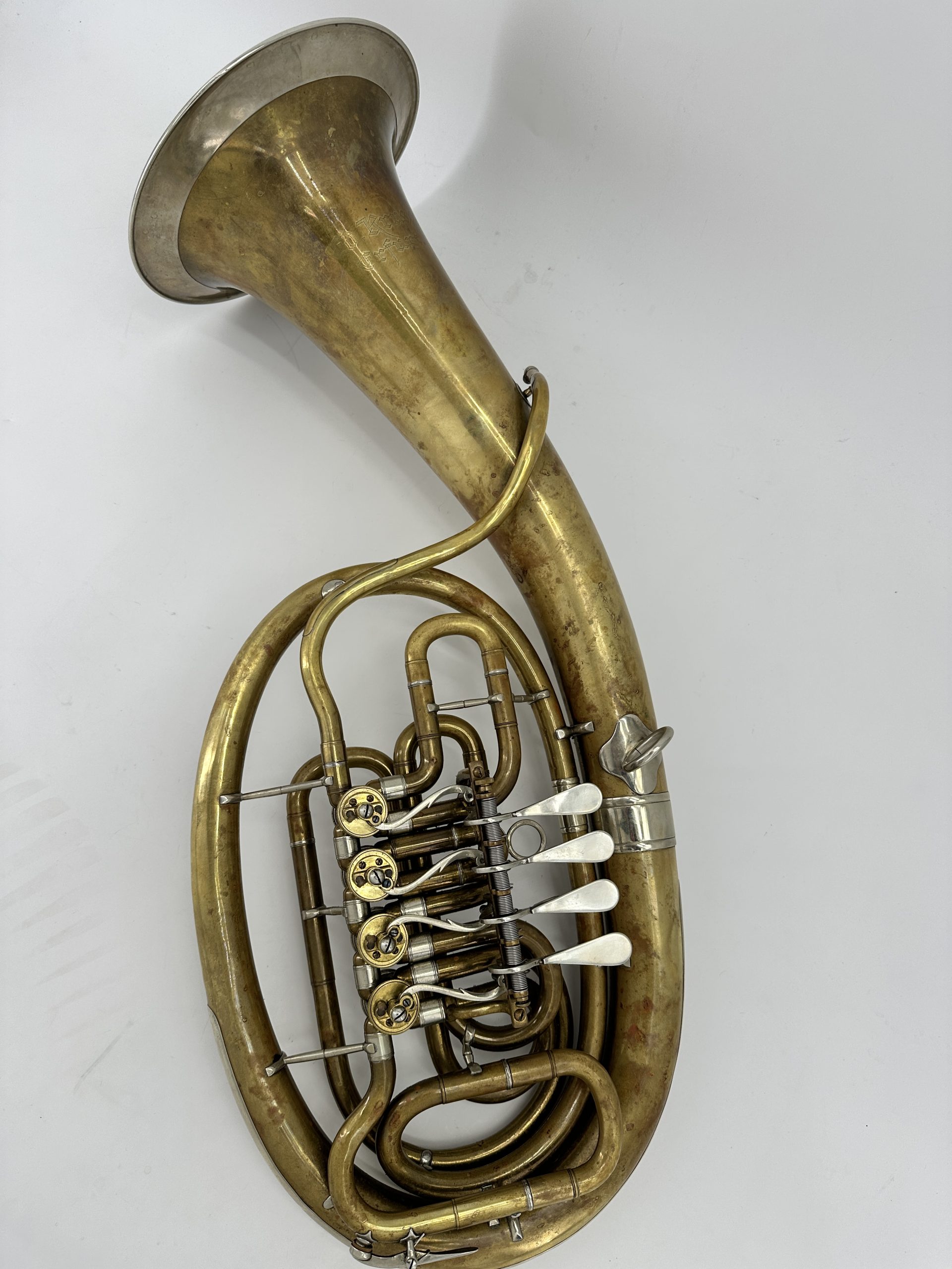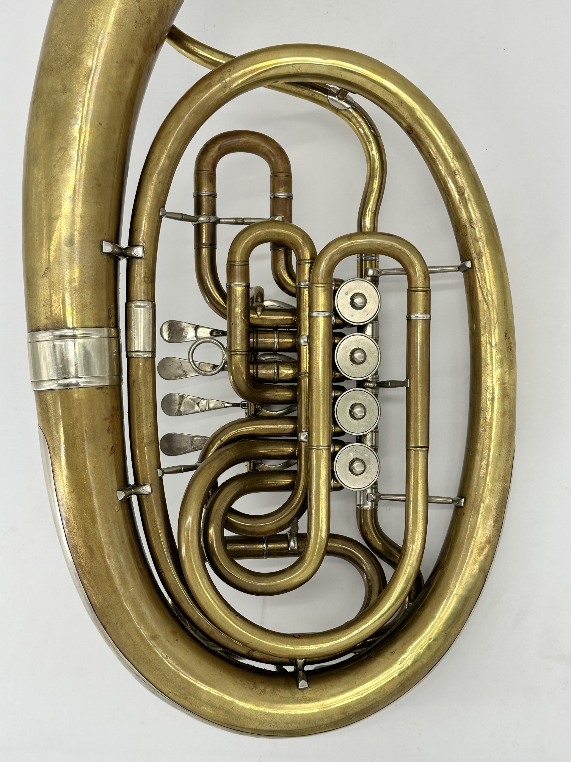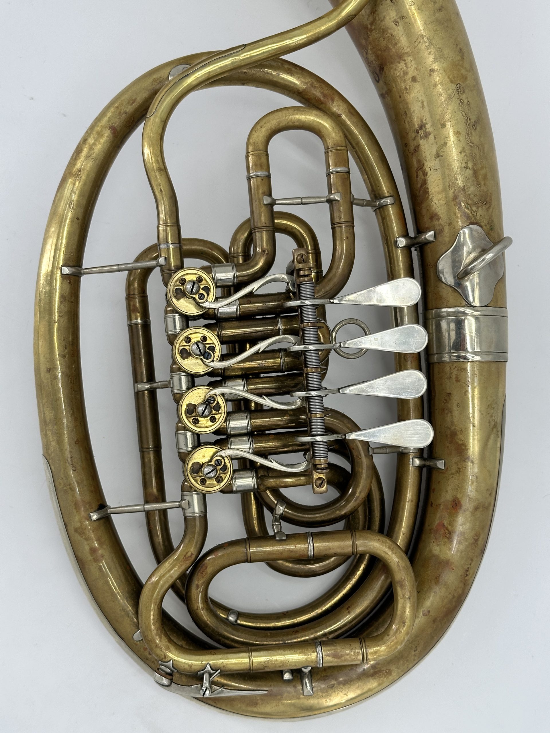Ed Kruspe enkel Bes Wagnertuba : Messing, vaste beker met Schmetterkranz, 4 ventielen, ongelakt inclusief originele soft Gig Bag. ! Compressie ventielen is zeer goed en hij klinkt geweldig !