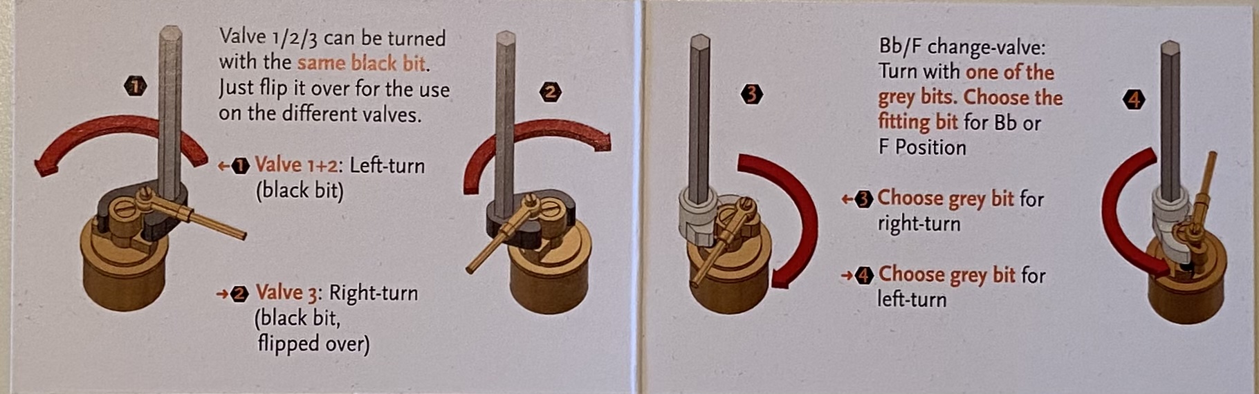Helpers in need! Often the valves are stuck after vacation, or in the case of less frequently used instruments and cannot be loosened without leaving traces or damage to the mechanism. This new tool is a great helper with which you can loosen the valves again without any problems. So you can play the horn again and if the valves have become lubricated and moving again after a few minutes of playing, it is no longer necessary to remove the rotors. This is often a problem, especially with Wagner tubas, which are often not in use for months. To order from Rimskys Horns, Dr.horn@kabelmail.de, or Klaus Fehr