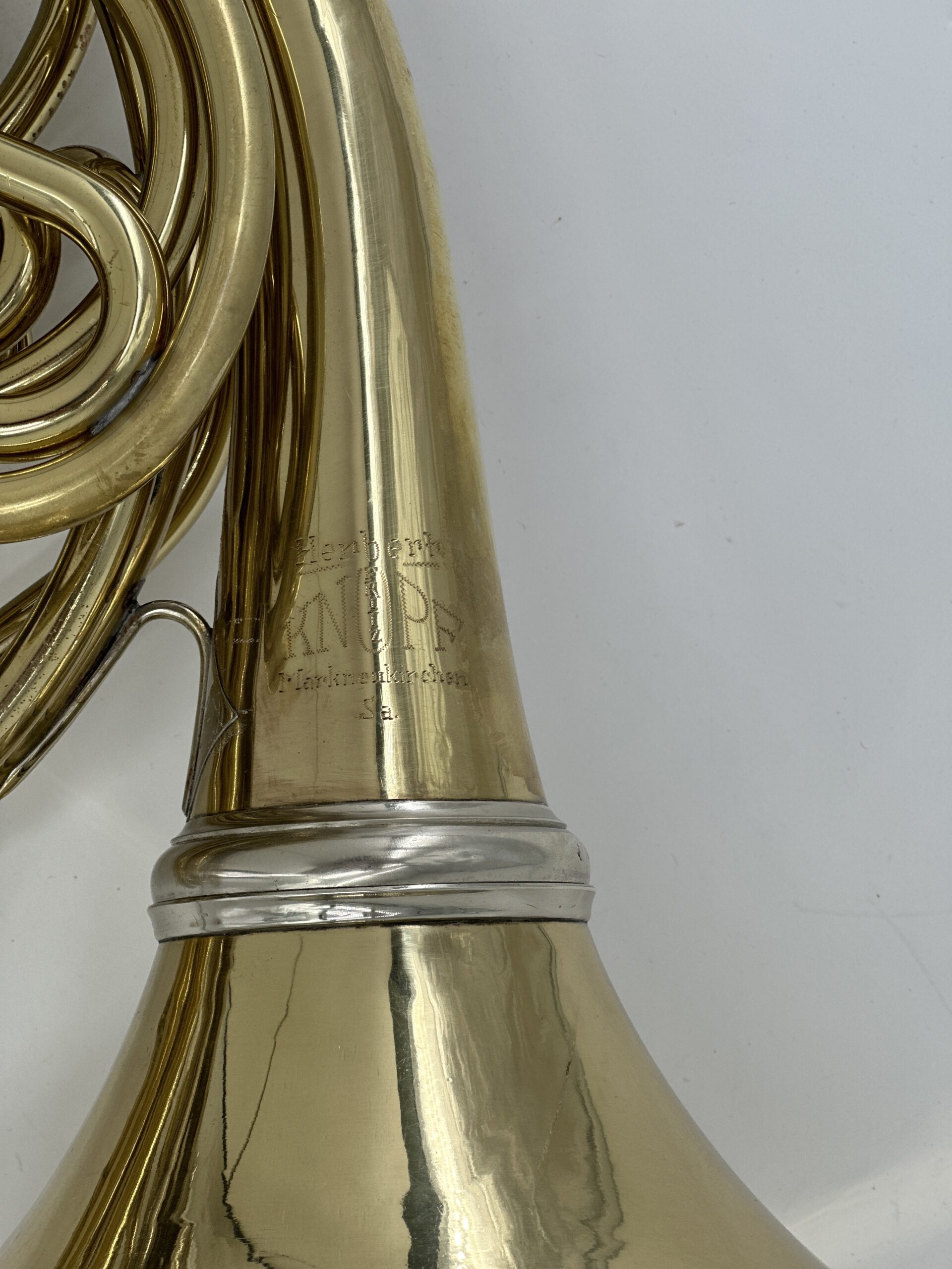 H.F.Knopf B/F model 17 : Messing, afschroefbare beker, stopventiel, gelakt (85%) inclusief koffer.heeft enkele patches rond de ring van de beker maar dat tast het spelen niet aan. Oudere hoorn maar speelt erg makkelijk.