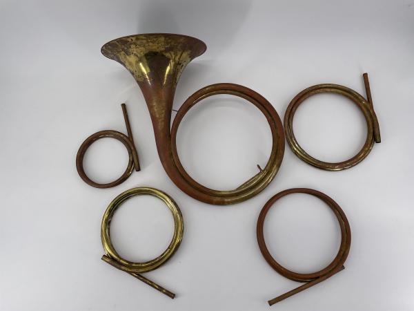 Jungwirth Barockhoorn model Ehe: Messing, ongelakt, vaste beker met mooie bewerkte schelpenrand, inclusief G, F, Eb, D bogen en originele koffer. Deze barokhoorn is gebaseerd op een origineel dat zich bevindt in het Germanisches Nationalmuseum (Germaans nationaal museum) in Neurenberg. Een korte stemschuif en het gebruik van stembuizen zorgen voor een breder toepassingsgebied van de hoorn. Stemming: a = 415 Hz, Crooks voor G, F, Eb, D. Dit is de dubbele gedraaide versie. De standaard wanddikte is 0,3 mm.