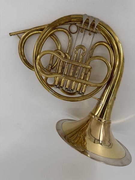 Jungwirth Weense Hoorn 2.0: Messing, ongelakt, “Speciale Overtone”  afschroefbare beker in 2 metalen: Messing//Neusilber met Schmetterkranz. Inclusief F- boog en inclusief Originele Gig Bag.