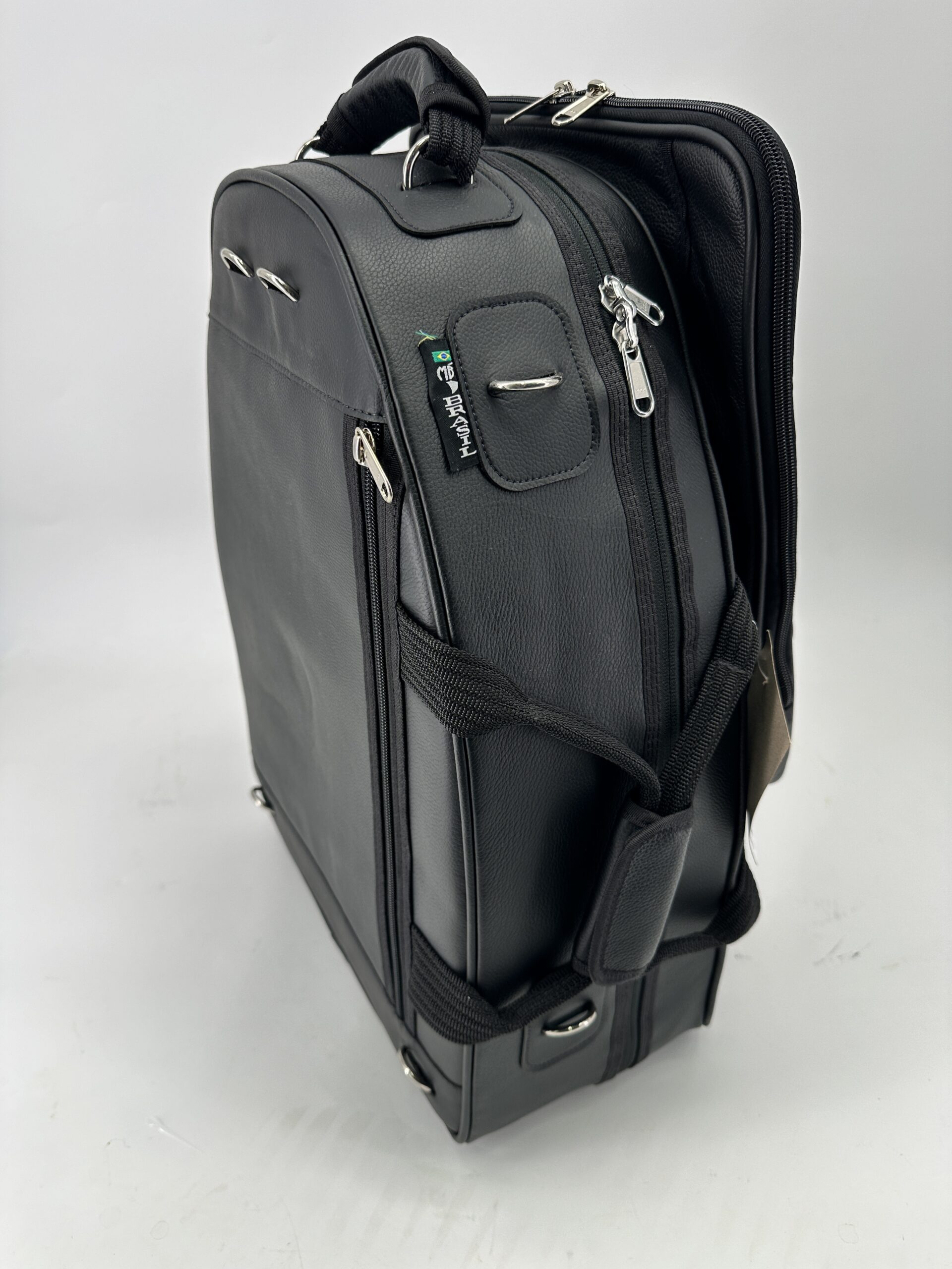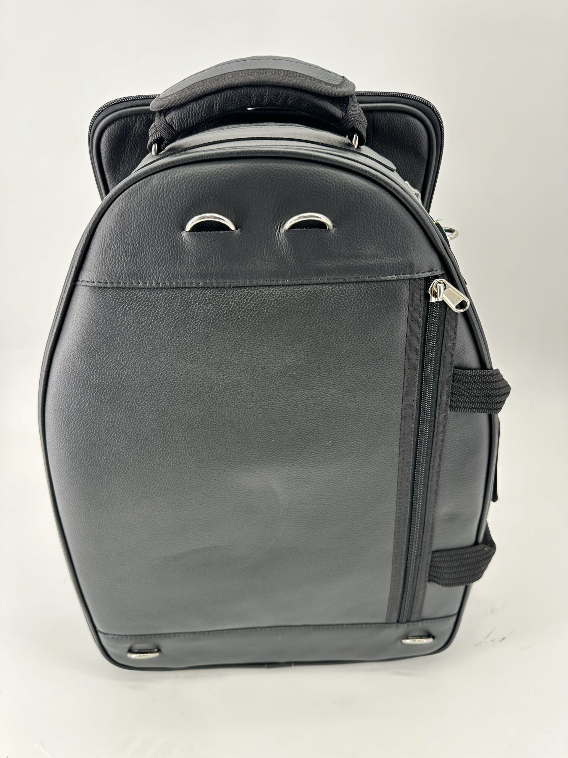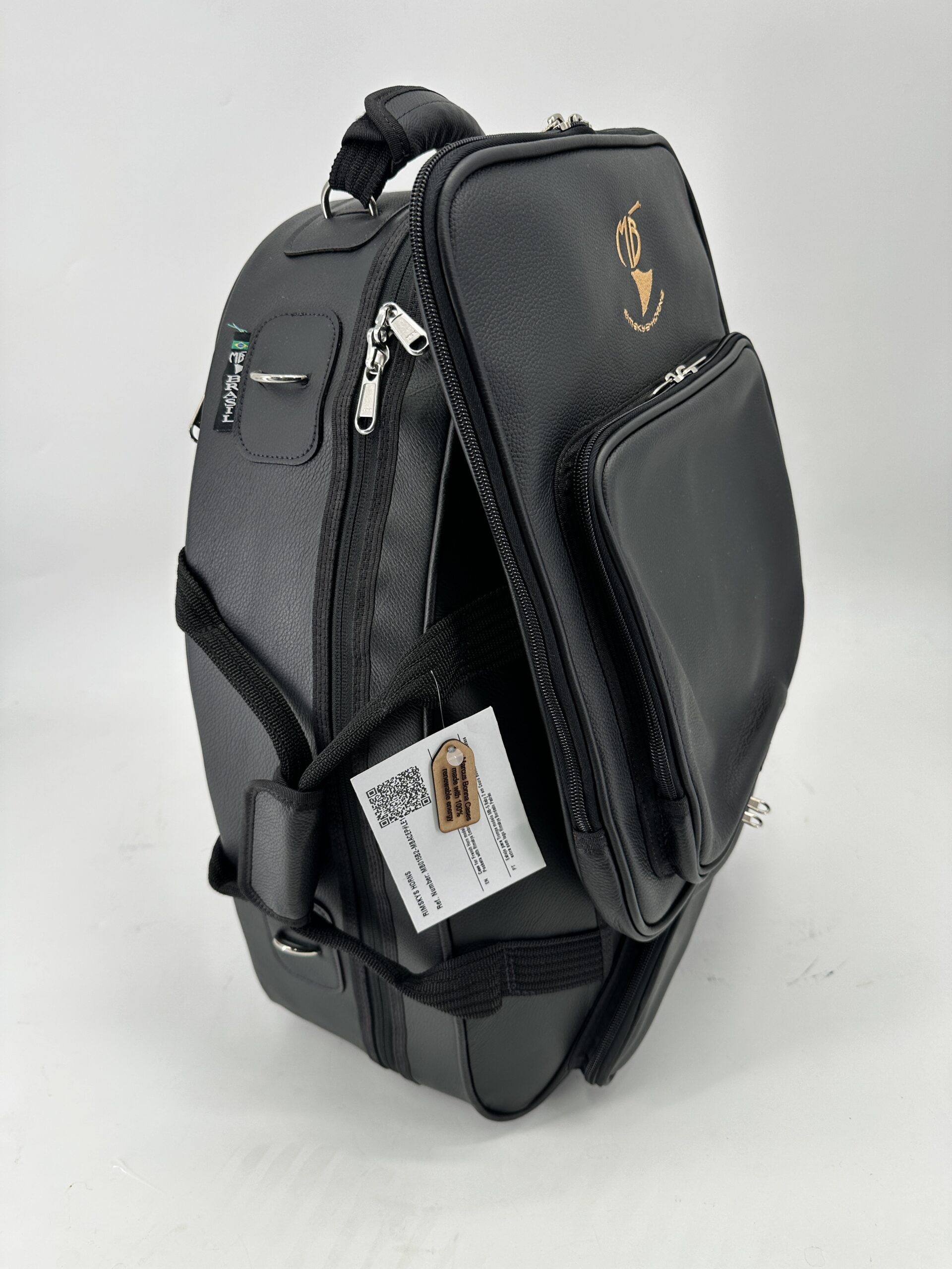 MB Baby-2 zwart koeleder met afritsbare muziektas en extra opbergvakken. Inclusief rugdraagbanden en mondstuktasje.