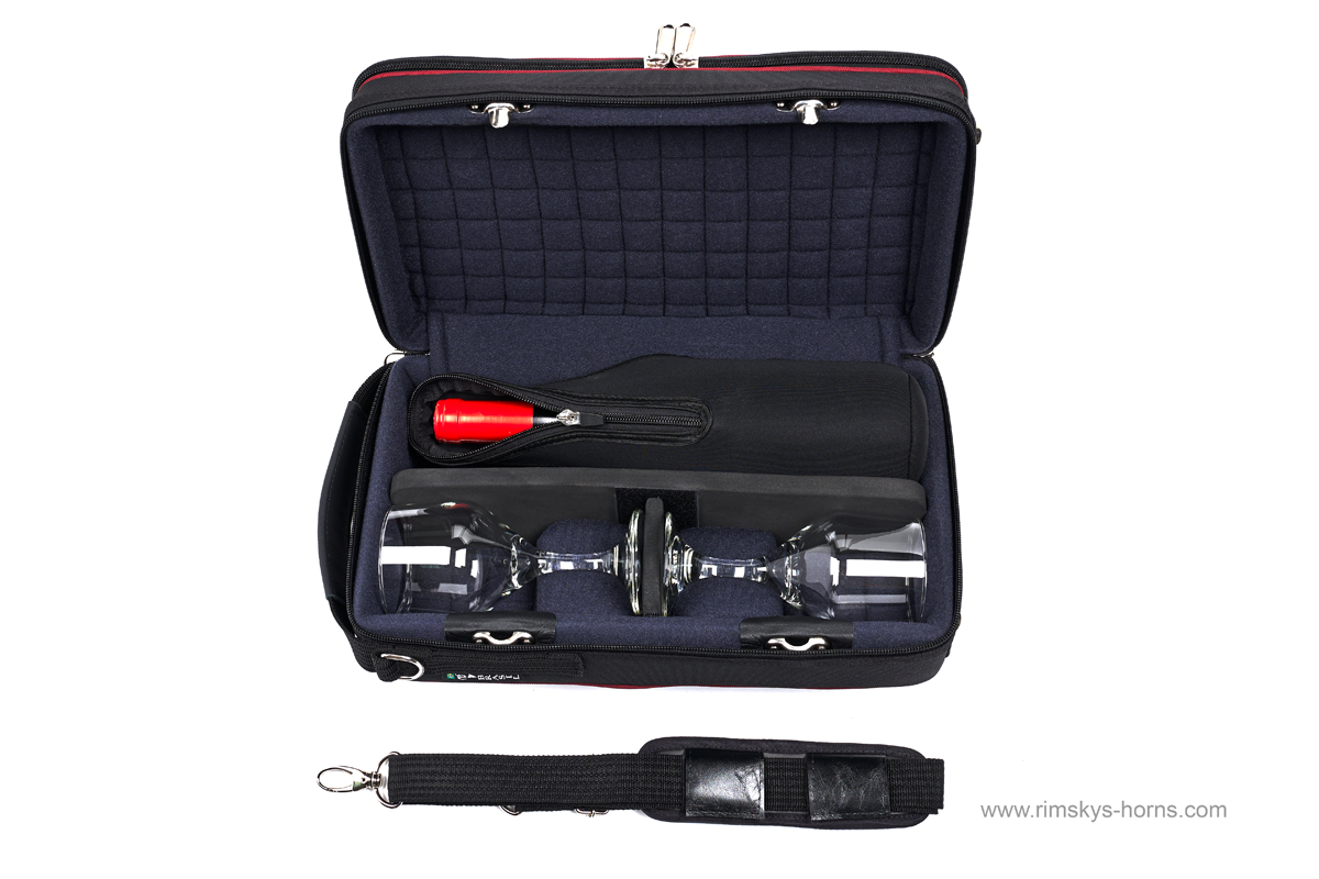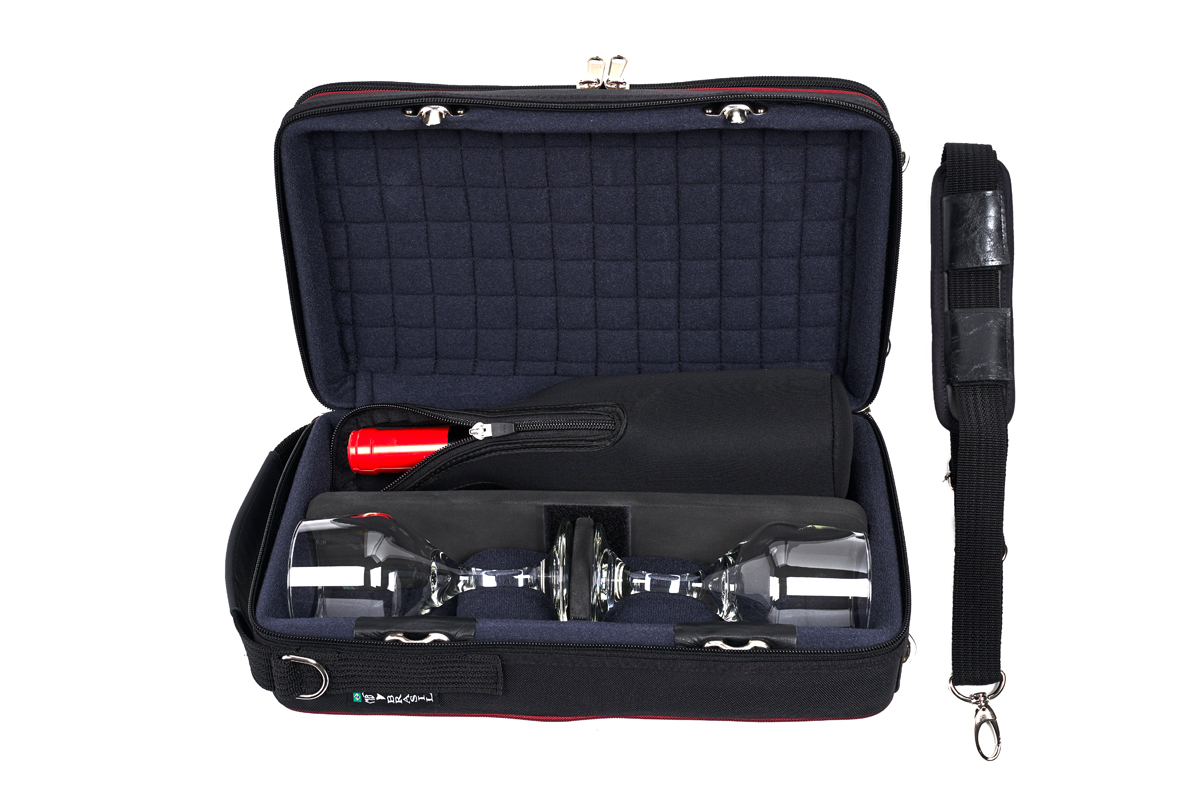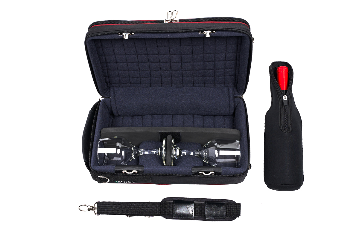 Inclusief schouderriem, tevens inclusief 1 kurkentrekker en 2 glazen.