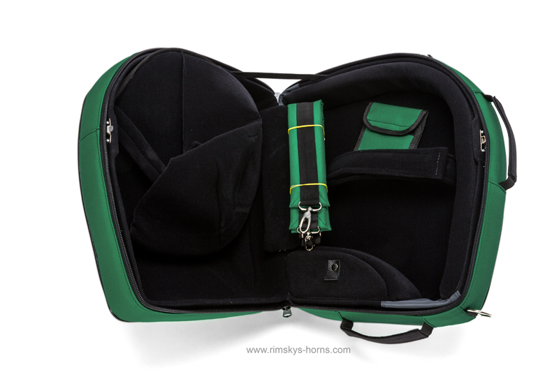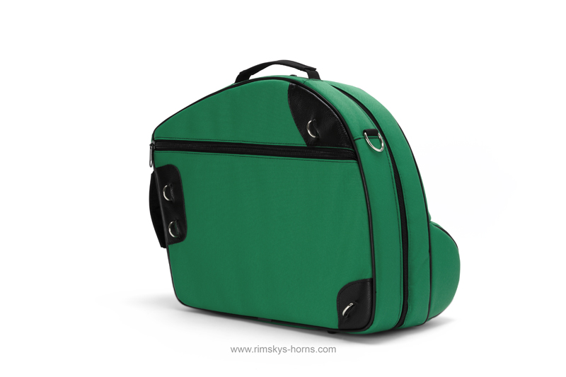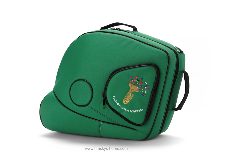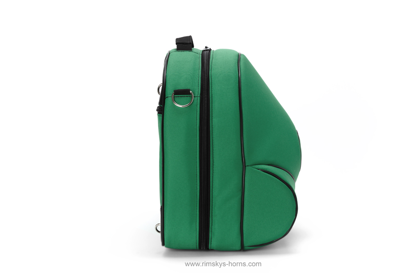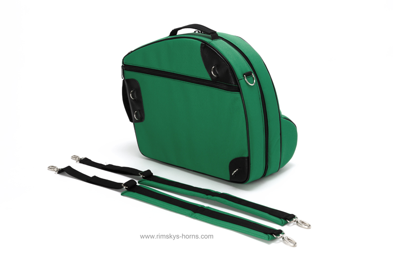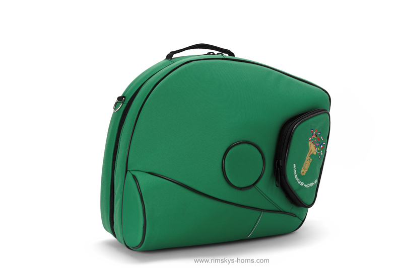 Rimskys-Horns Gigbag, ruimte voor Demper, incl.mondstuktasje en 3 draagbanden. Kleur lichtgroen of donkergroen.